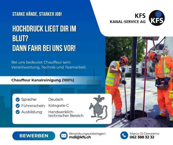 Dann bist du bei uns richtig! Bei KFS Kanal-Service AG bist du nicht einfach Chauffeur, sondern ein wichtiger Teil des Teams, das für saubere Leitungen und zufriedene Kunden sorgt. Mit modernen Hochdruckfahrzeugen führst du anspruchsvolle Kanalreinigungsarbeiten durch – im öffentlichen Netz wie auch auf privaten Anlagen.
